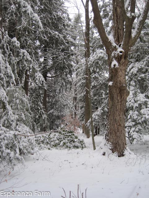 This is a somewhat deceptive photo of perhaps one the most important features of the place. From its purchase in 1872 Julie began planting trees in front of the house, between it and the then sleepy road. She added to the already extant group of two Sugar maples and two Norways, with a grouping of Norway spruces, and a line of maples along the road. By the 1880’s a commentator noted that it was going to become a ‘lovely grove’ in front of the property. Such natural landscaping, while all the rage in the cities where the first great landscape parks were being created, was unusual in an area dominated by open fields, charcoal wood lots, and the picturesque but rigid lines of sugar maples along hedgerows. Over the century this grove has gradually been bulked up with more trees. And more distance. And, of course, size: many of the trees are between 70 and 90 feet in height. The maple in the foreground was orginally planted on the road edge. Mercifully, when the state highway was created in the 1930’s, it was moved away from the house. It is actually visible in this photo, at the center back. The road, like the house, runs north-south; this photo was taken looking directly northeast.