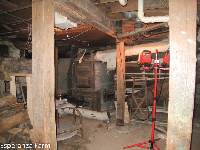 People sometimes wonder how Esperanza is heated: today an oil furnace and steam heat. However, there was a gravity feed hot air system in the north end of the house from its construction in 1893 to the 1960’s; in addition to the steam heat system in most of the rest of the house*. The air was heated by a coal fired furnace in the basement; the duct work ran (and still does) throughout the upper two floors. The furnace still occupies a large portion of a basement room, being about 7 feet tall and four feet wide. Originally, there were eleven ducts coming either into or out of the furnace, and some ran at about six feet off the floor. Wrapped in white insulation*, which over the years had sagged, snaking off into crawl-spaces, and being in a very dark space, it is not entirely surprising that it earned the term the Octopus. A few years ago, one of the cats ended up in the ducts (he fell through a hole in a main duct) and several of the lowest arms ended up being removed in the process of attempting to get him out. That, combined with corralling the insulation, has made it much less spooky. Some times people argue that we ought to take it out, as it is utterly unusable*. But, I have to admit that I have grown to like it down there. Not simply as a personality, but because it adds ‘character’. I kind of like spooky houses. Besides, why take it out if it doesn’t bother one?