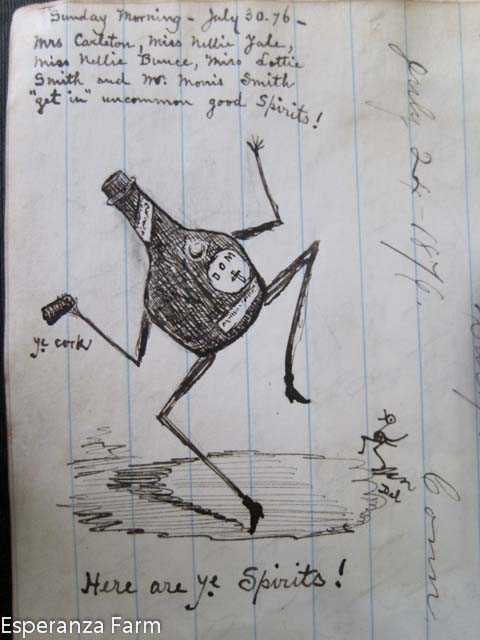Once again the dancing bird is the author’s signature. Perhaps one of the Carletons. Mrs. Carleton was the wife of Julie’s publisher George W. Carleton, and they often came out for weekends. Nellie Yale is Helen Ellsworth, Nellie Bunce was one of her friends, Lottie is Carlotta Smith (Helen’s older sister), Morris is Julie’s husband and the father of Helen and Carlotta. Judging by the bottle, I suspect dancing was involved. Music (Carlotta was a pianist) and theater (Helen’s love) were also likely to have been part of the entertainment.