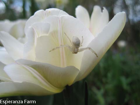 This little guy has been camped out in this tulip for several days, even through yesterday’s rain. I am not sure what he is going to do about the fact that the tulip in question is steadily turning pink…can spiders change colour?