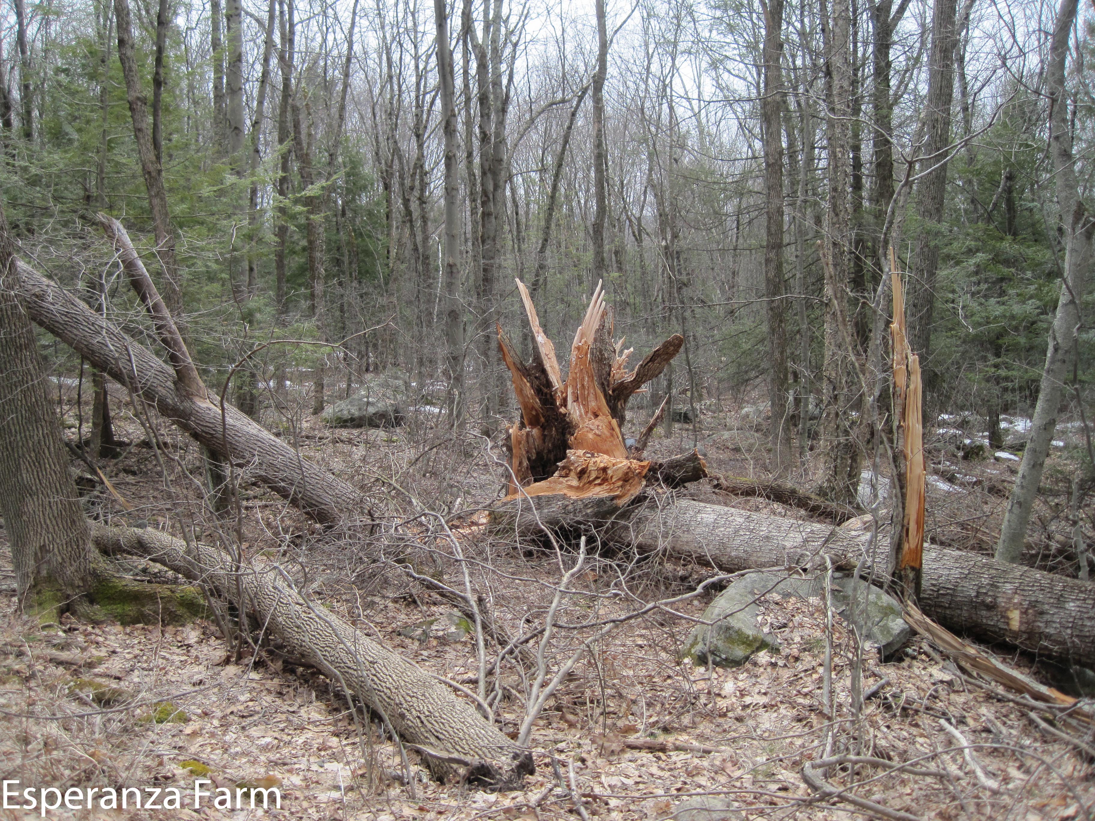 Down below Julie’s Pond, there was a massive triple-trunk Black Willow. A few years ago, one trunk failed, during this year’s storms the other two finally went, first one and then the other in different storms. Each trunk was a solid 18 inch diameter, and they split off about 7 feet above the base. The ruined base made for a fun set of photos. For scale, the horizontal broken piece in the first photo was about 6 feet off the ground.