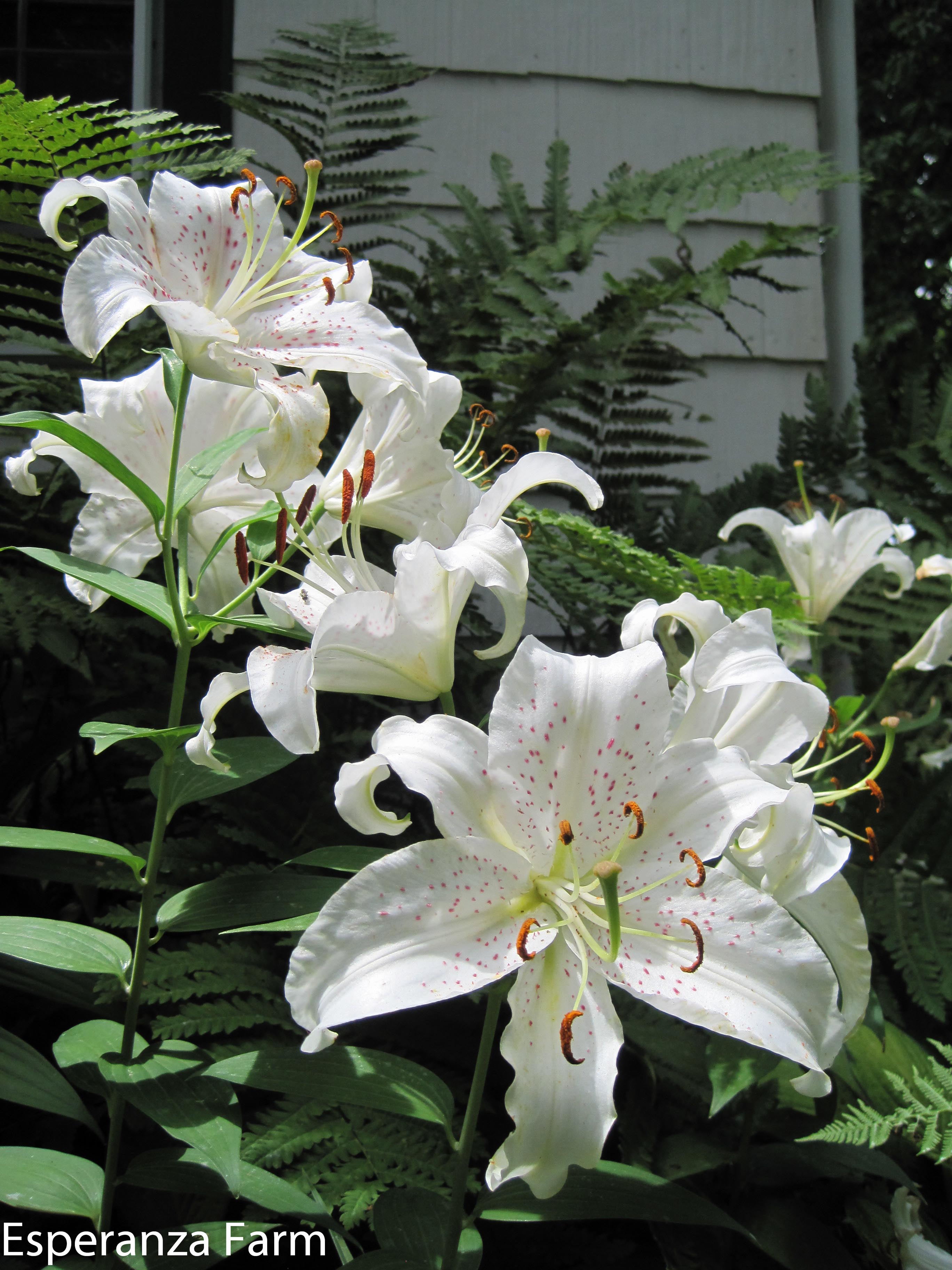 In my opinion, it would not be late July in New England without a big stand of Oriental Lilies by the main door. Preferably located where their fragrance, which is strongest at night, can drift inside. It is a spicy scent, not ‘floral’ really at all. They are a little early this year, they really ought to be in August; but I certainly enjoy them. It is also worthwhile to note that while the lily beetles will eat them, they prefer the Asiatic lilies; so the latter can function as a trap reducing the amount of effort needed to protect the Oriental lilies. Though one still needs to keep a very close eye on them. Support is also useful, in this spot some ferns help out, elsewhere, lanky rugosa roses give some support.