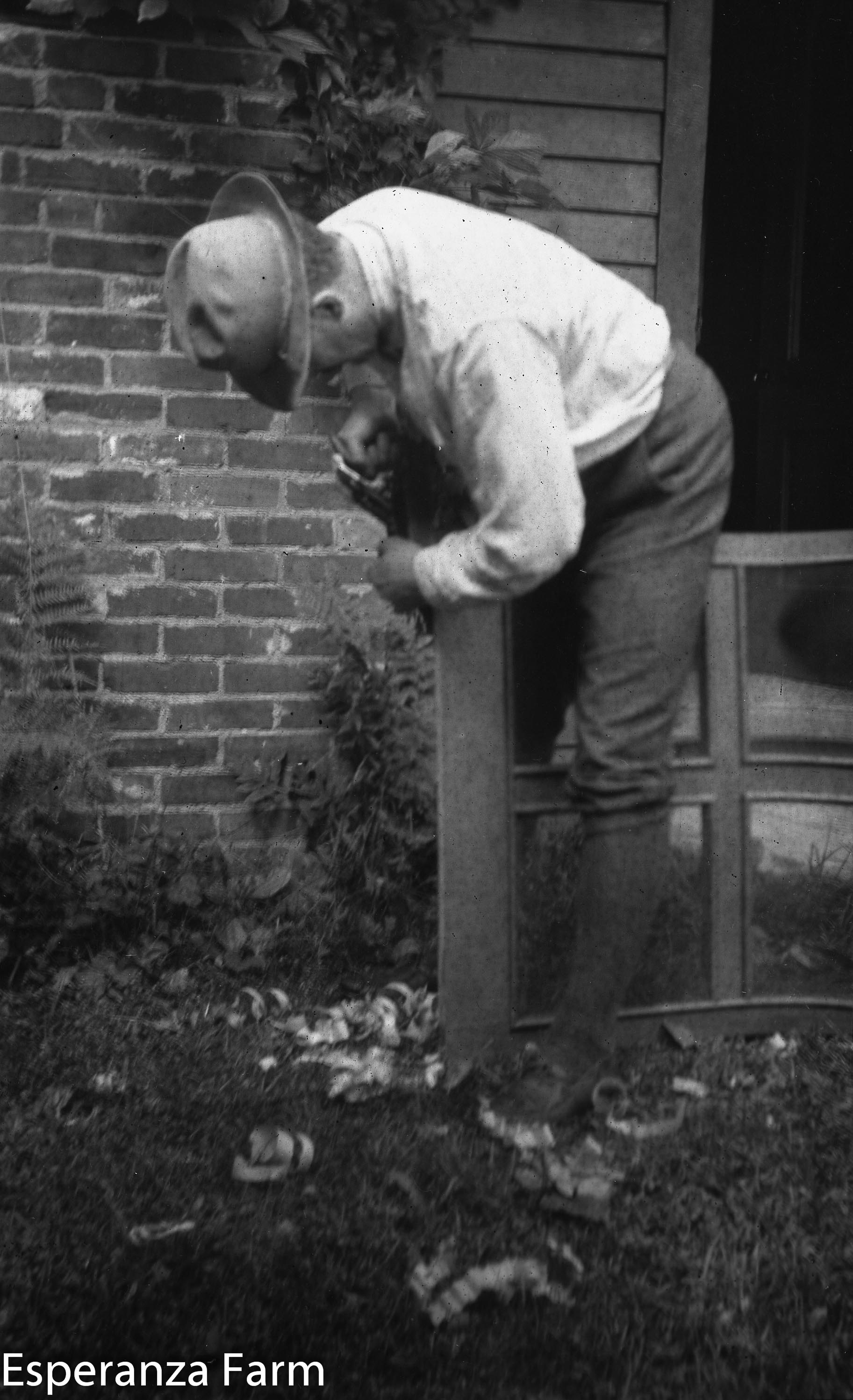 I do know the door is Happy Thought’s east door, I don’t know who the person is. I do like the knee socks and pork pie hat though. This is Not, by the way, how one is supposed to fix a door. It would appear he is shaving off the bottom of the door rather than rehanging it. Which, come to think of it, accounts for the gap….