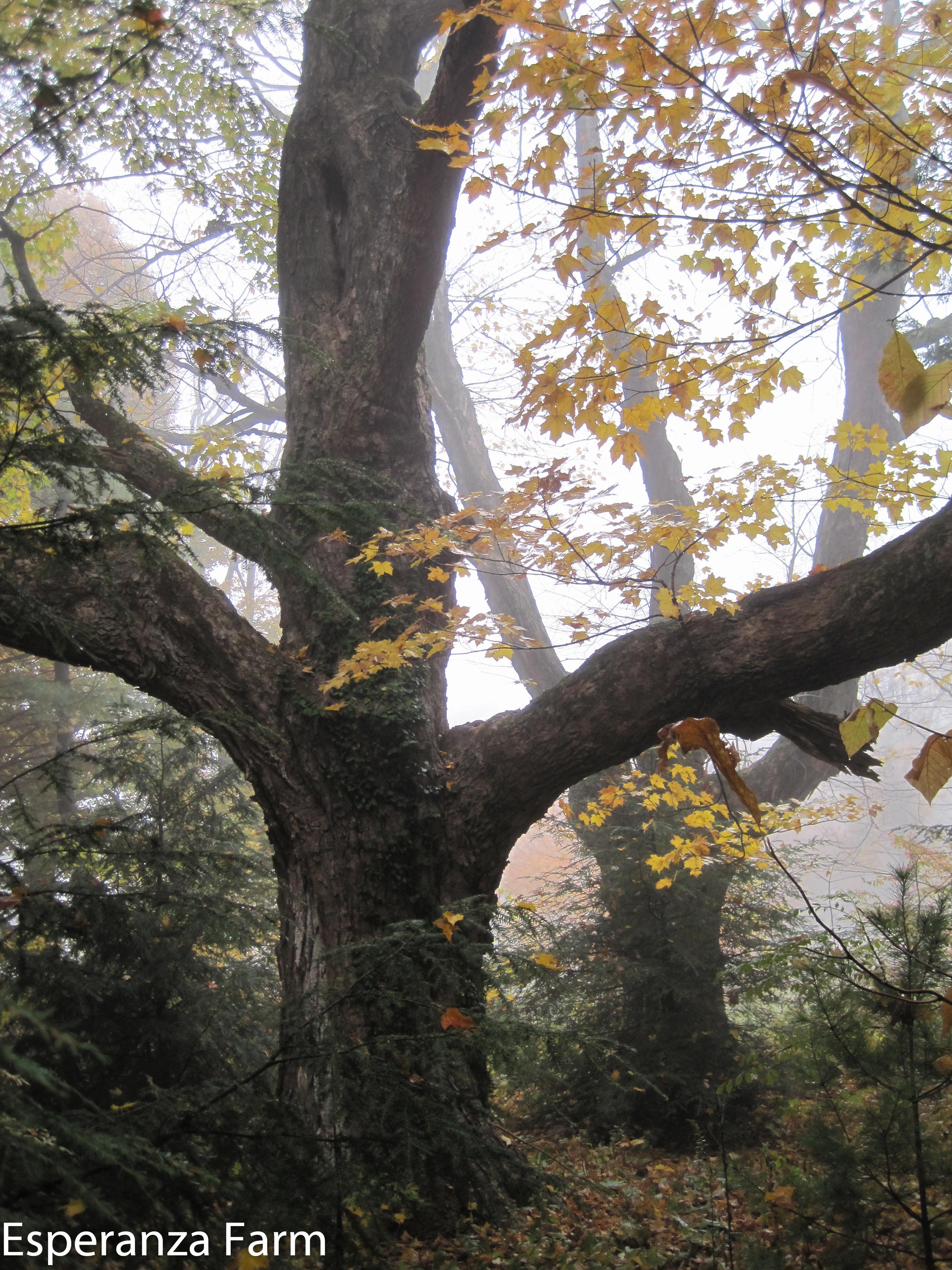 Out beyond the big garden, lining the old road.  It is essentially impossible to get a good picture of them, too big and too close! I cannot touch the bottom of those lower limbs, however, even on my toes and arm outstretched. We have planted beneath them with a mix of evergreens, as the new road/highway is only about fifty feet away from this point, off to the right of the photo.
