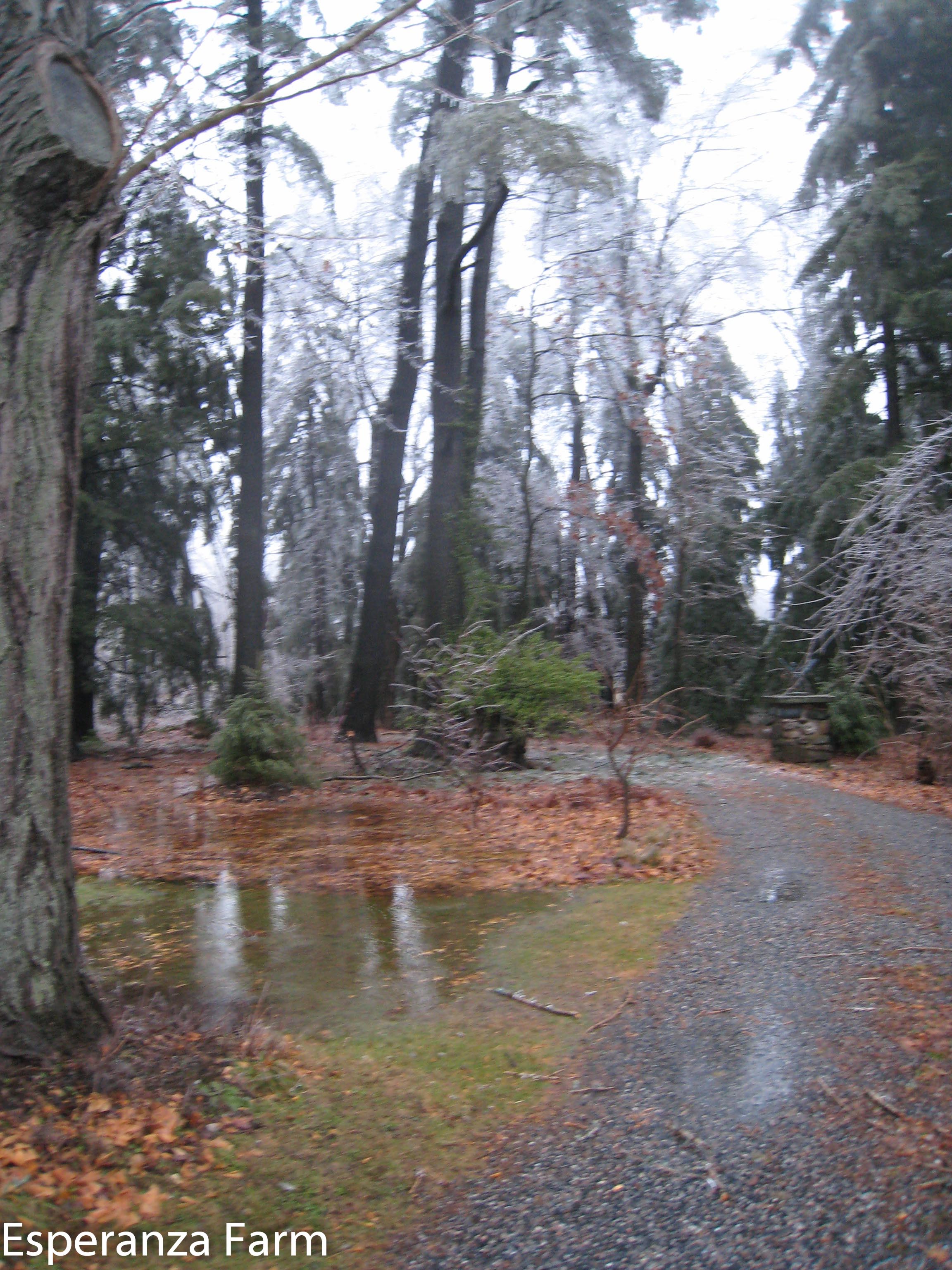 This shows a light ice-load on the trees east of the house, you can see how the Norway Spruces in the background (which normally would be touching) have turned into individual ‘cones’ as the branches are weighed down. The closest trees are pines, and you can just tell that the main branches do not flex at all, only the smaller branches under a few inches in diameter. The Maples in the midground have not changed shape at all.