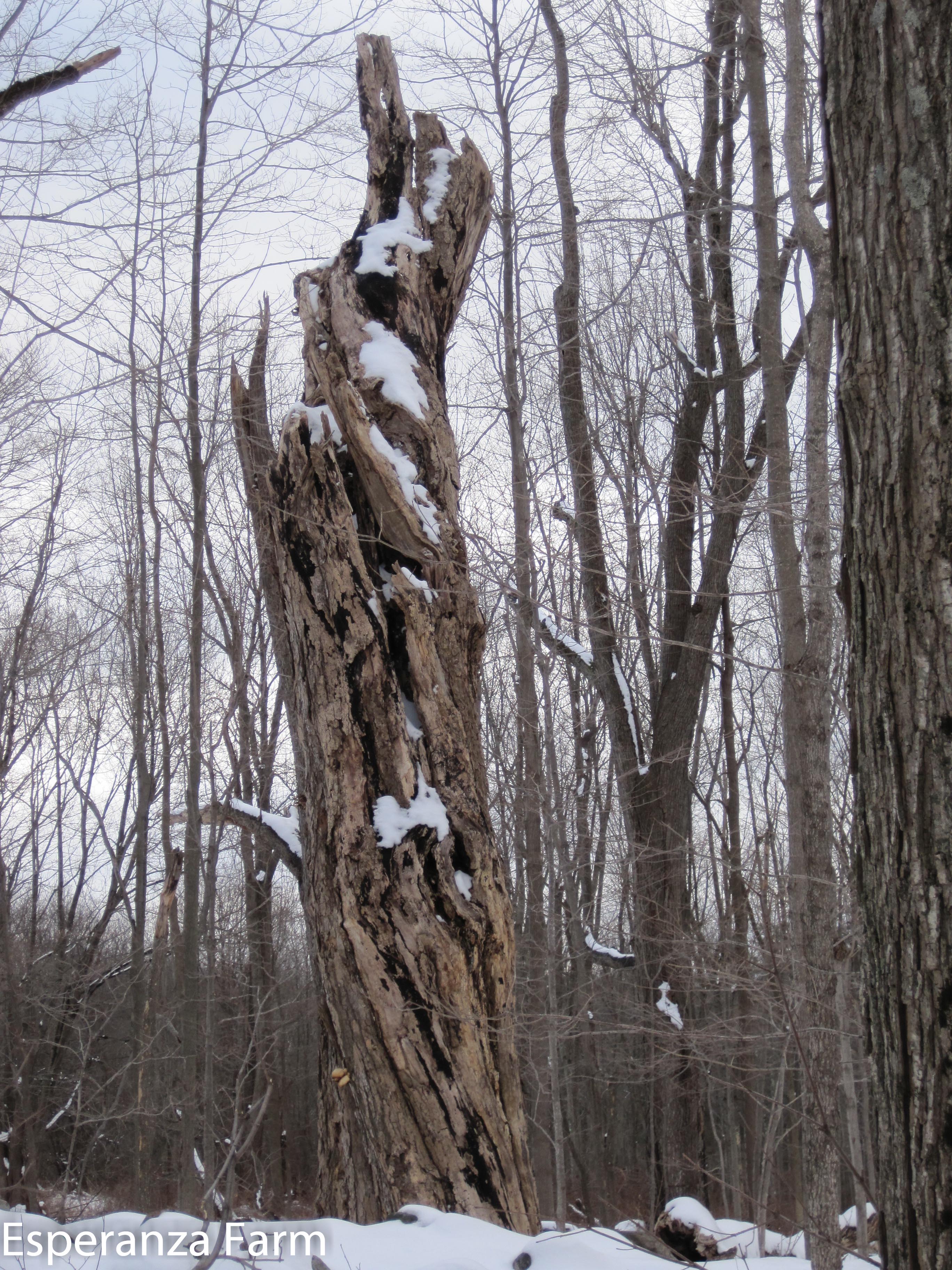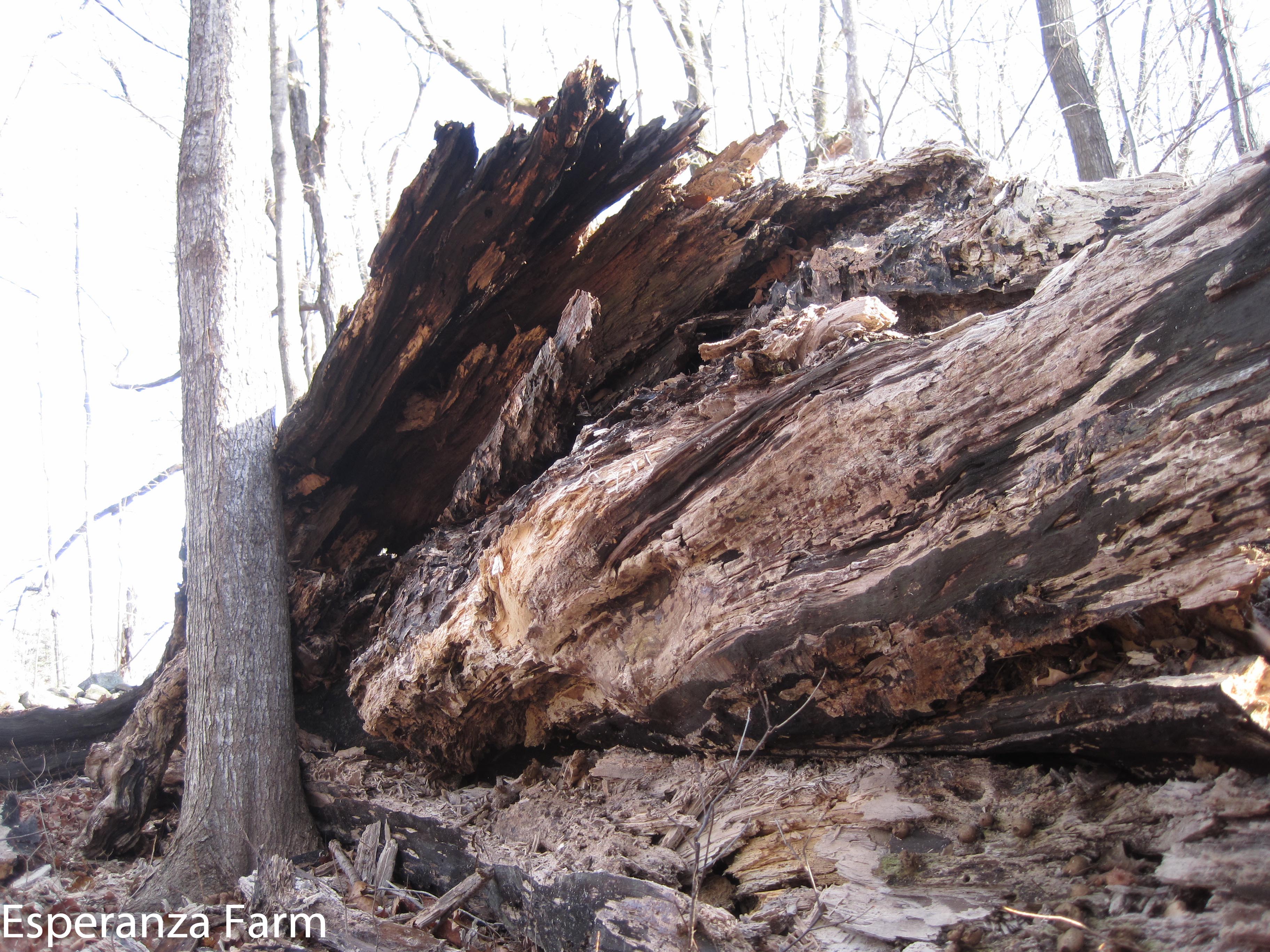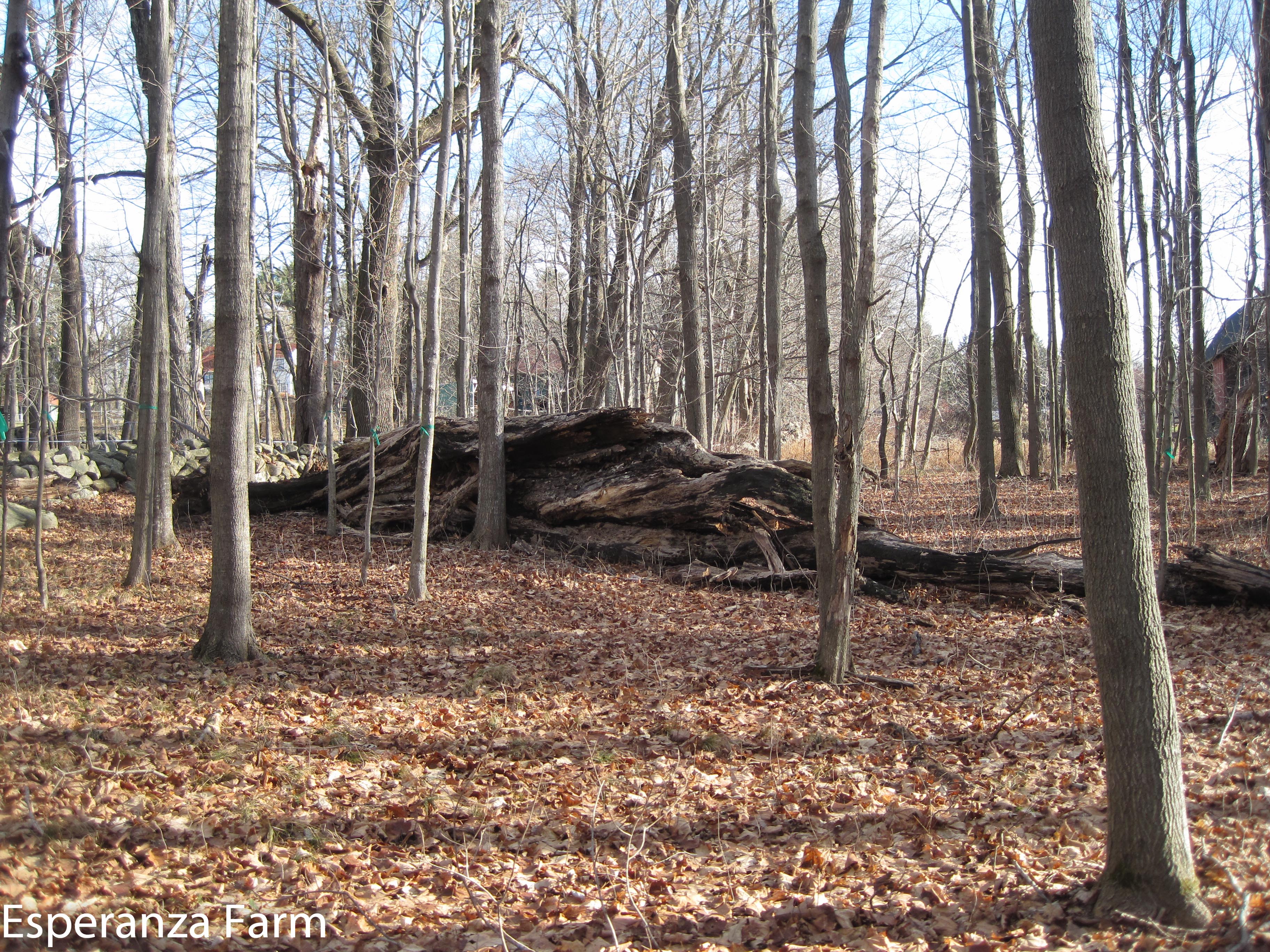 Well, it had to fall over some day…this big sugar maple snapped about a dozen years ago, the snag toppled the other day in the rain and wind. For a bit of scale, the young tree it is leaning against is about 8 inches in diameter (dbi). At its greatest, the fallen trunk is around five feet tall and three feet wide. The second photo is taken from over fifty feet away. Big snags like this always put me in mind of some of the illustrations and descriptions in Moby Dick, whales of the forest.