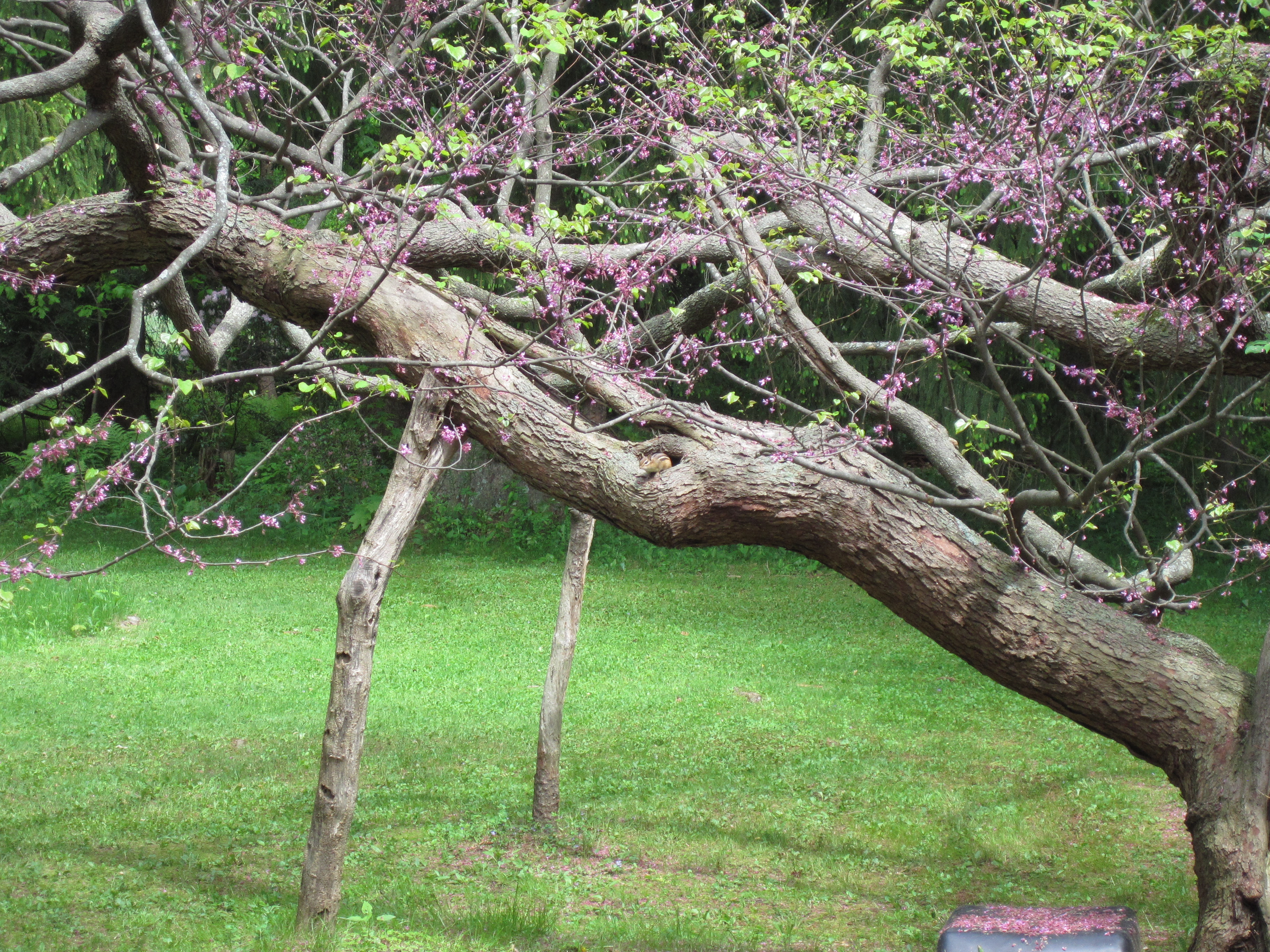 Home sweet home! The redbud has some rather nice hollows in it, close access to the bird feeder and some spruce trees…what’s not to like? Look closely at the center of the first photo…. now if they would stay out of the vegetable garden!