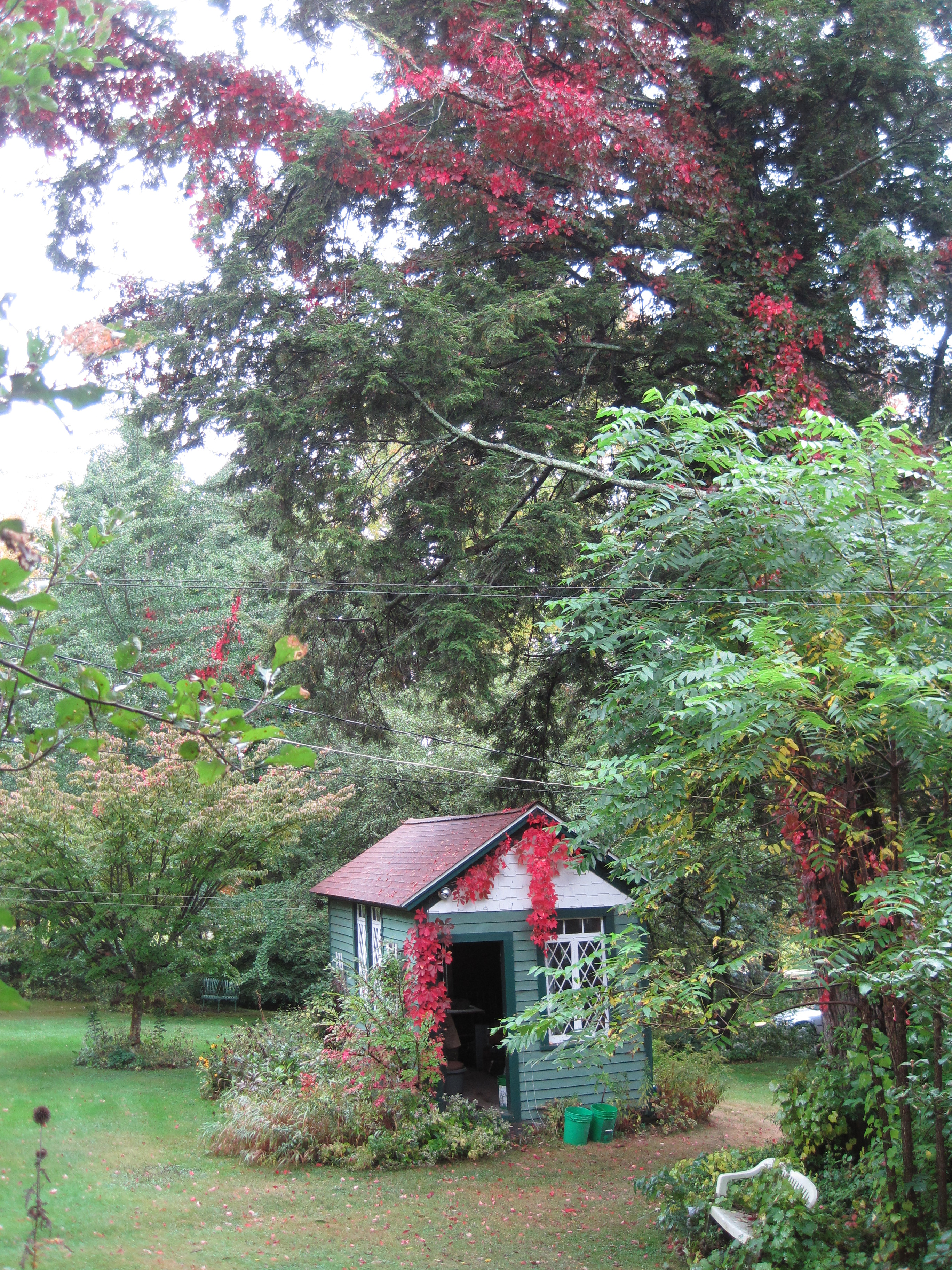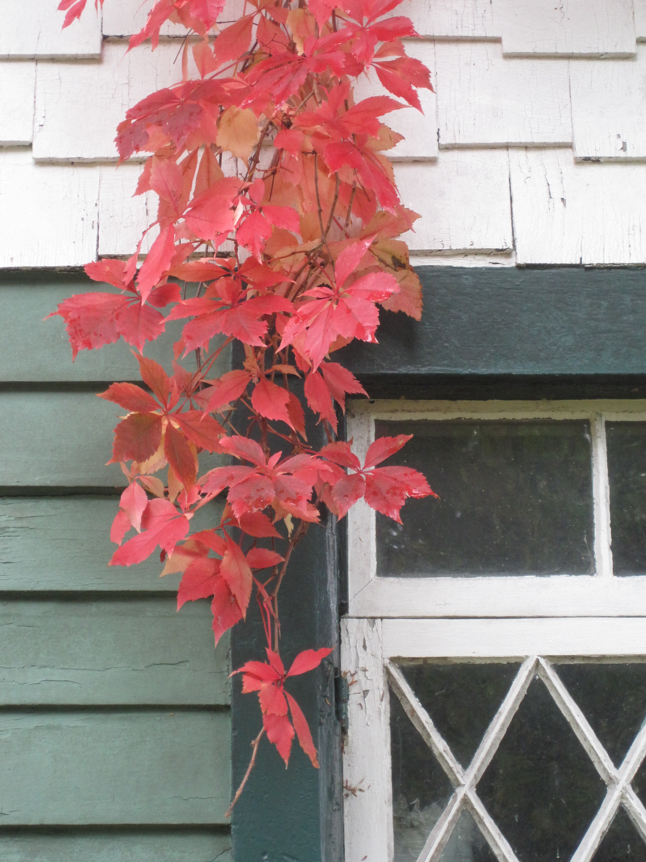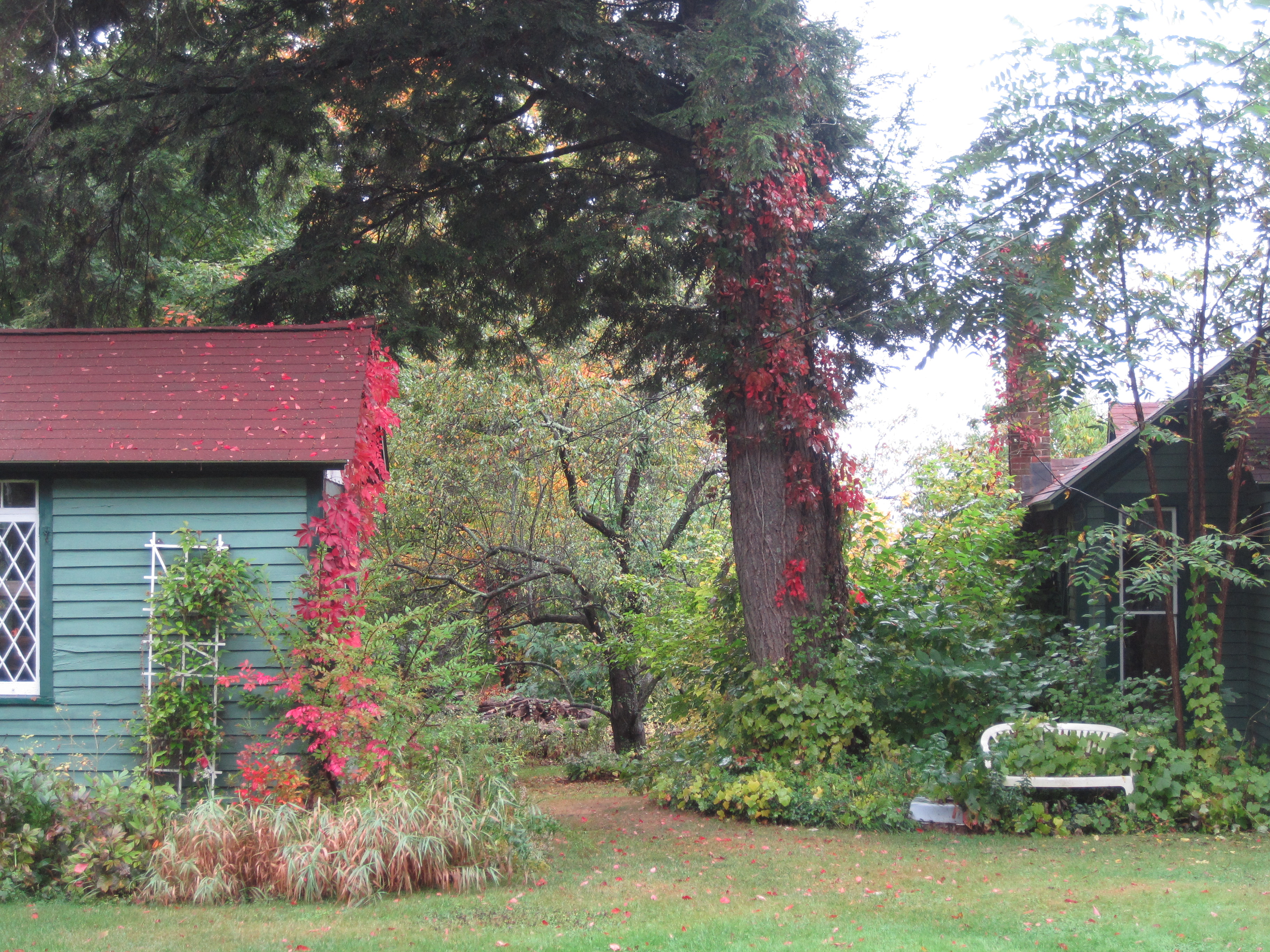 Well not really, actually. The woodbine (virginia creeper) is particularly happy this year. These pictures don’t do justice to the one growing in the hemlock at all, nor to festooned chimney on the little house (not visible in the first picture). But take note of the gingko tree in the background, the woodbine has quite quietly established itself in it.