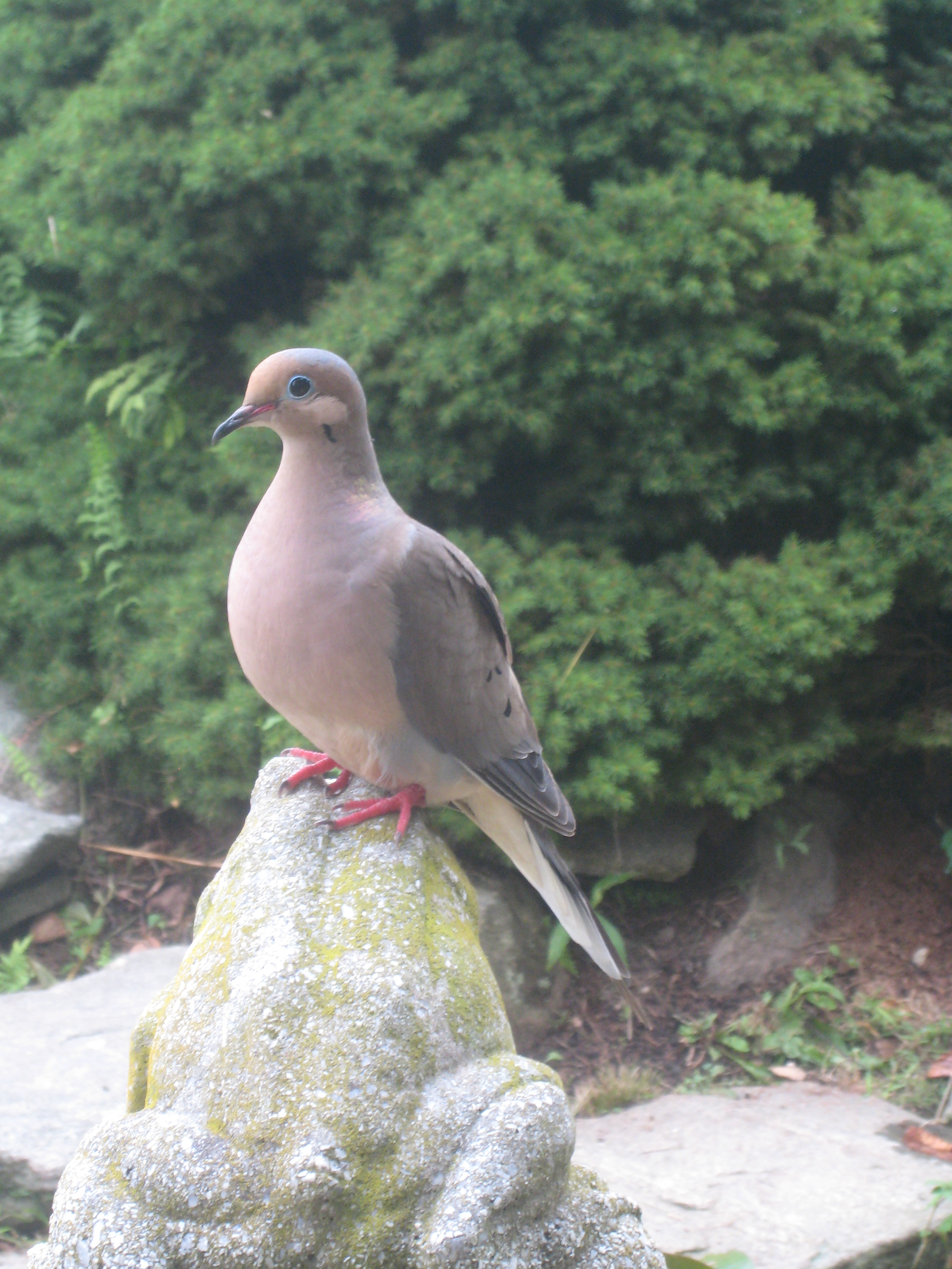 Which is a long way of explaining why I was so glad that I checked the fish pond the other day. We have been having difficulties with the current arrangement (see Zombie Fish) and I had set the heater to run* and turned the pump off. What I didn’t consider was that turning off the pump meant turning off the waterfall. This meant that all the open water was now under the net around the bubblers. The net is fine, black mesh. The mourning dove flock had a habit of coming to the waterfall at dusk for their drink. I think you can guess where this is going.