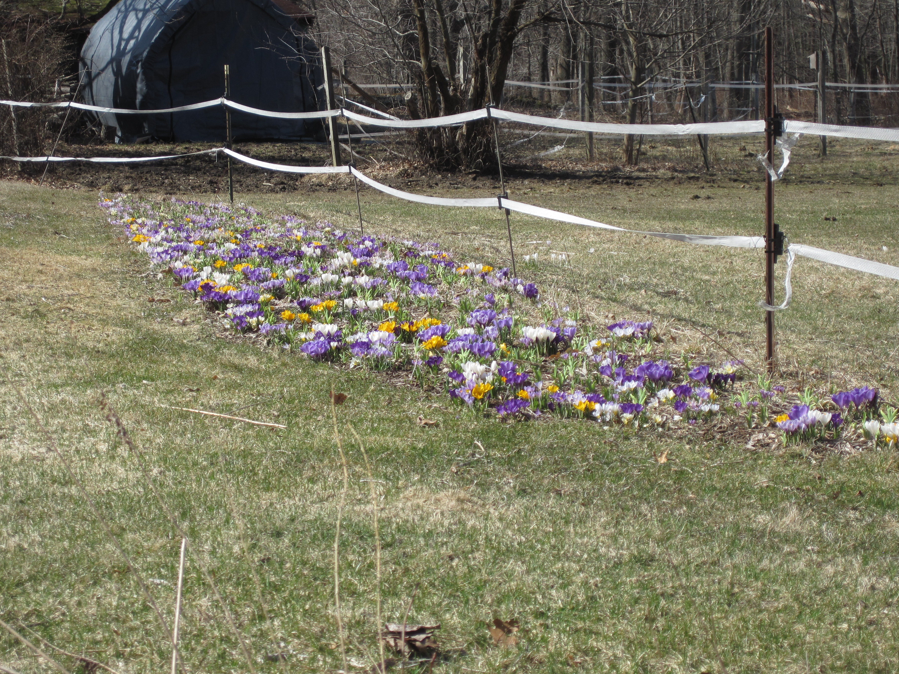 As requested, from last year (April 9th, 2014) when c. vernus were at the height of their bloom. By that date in early April the species crocus were largely past. This year, considering the snow still out there, who knows when they will flower; in comparison, the snow is currently at the lower fence line as seen in the photo. Spring, though, is fast. Even with that snow out there, it is possible that the c. vernus will be in bloom only a week or so later than last year. We shall see!