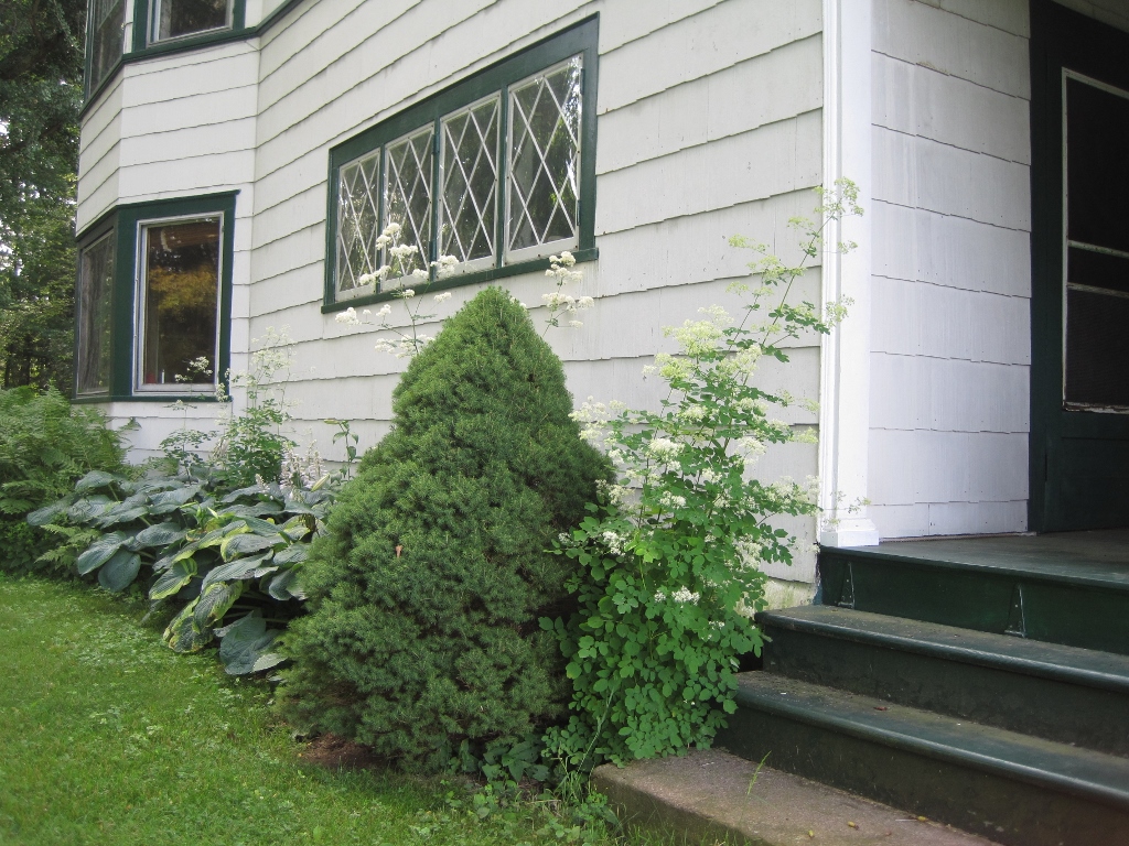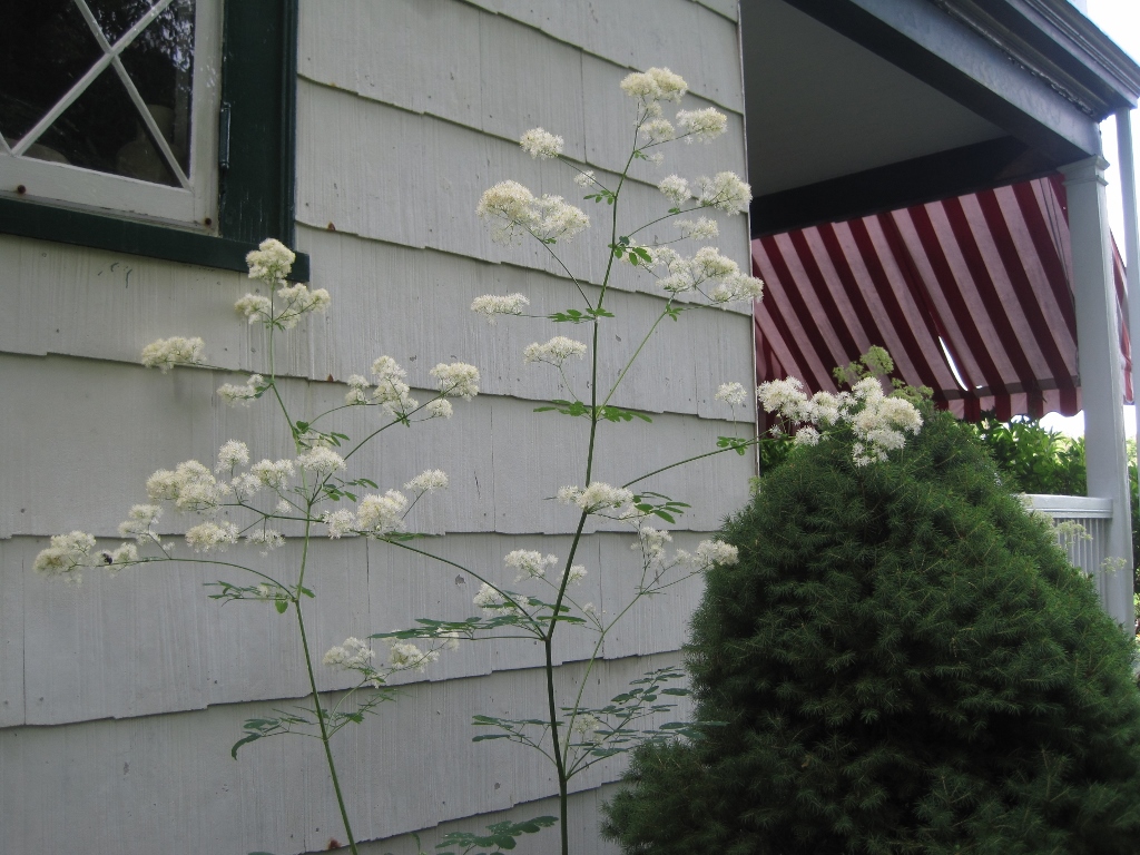 Also known as Meadow-Rue. Now, which Thalictrum it is I don’t know. (It is ‘a difficult genus with poorly understood species boundaries’ according to Wikipedia, Oy!) Our common roadside one though, doing admirably as a garden plant under the library windows. Very consistent structure to its blossom spikes and quite capable of getting six feet tall.