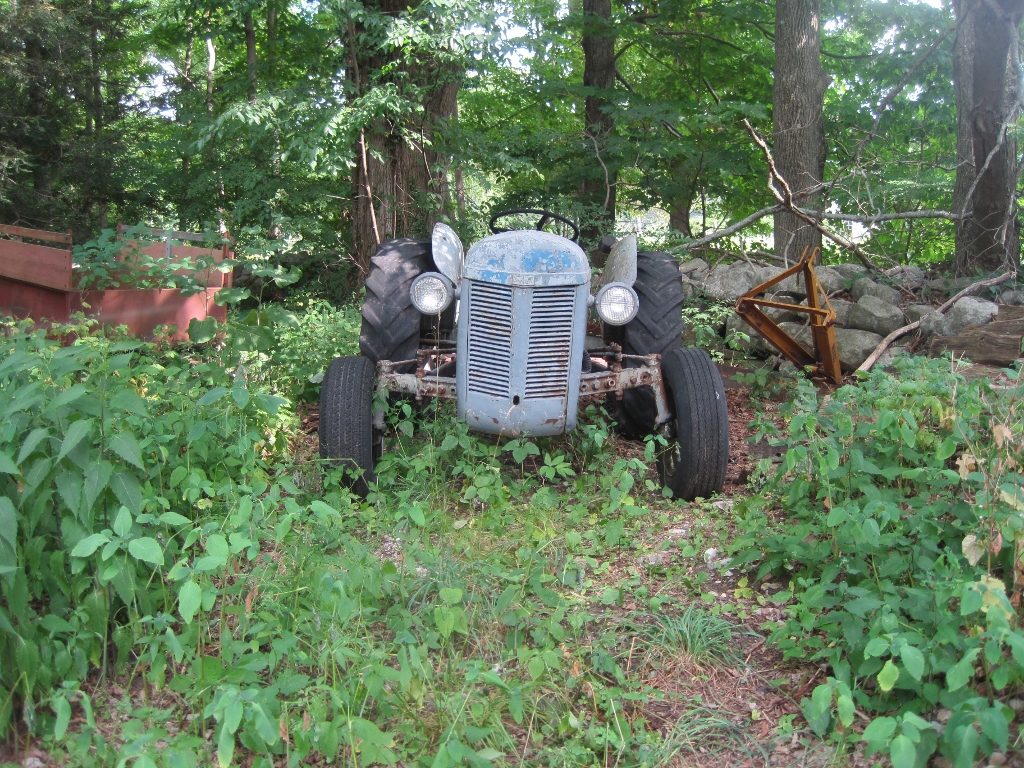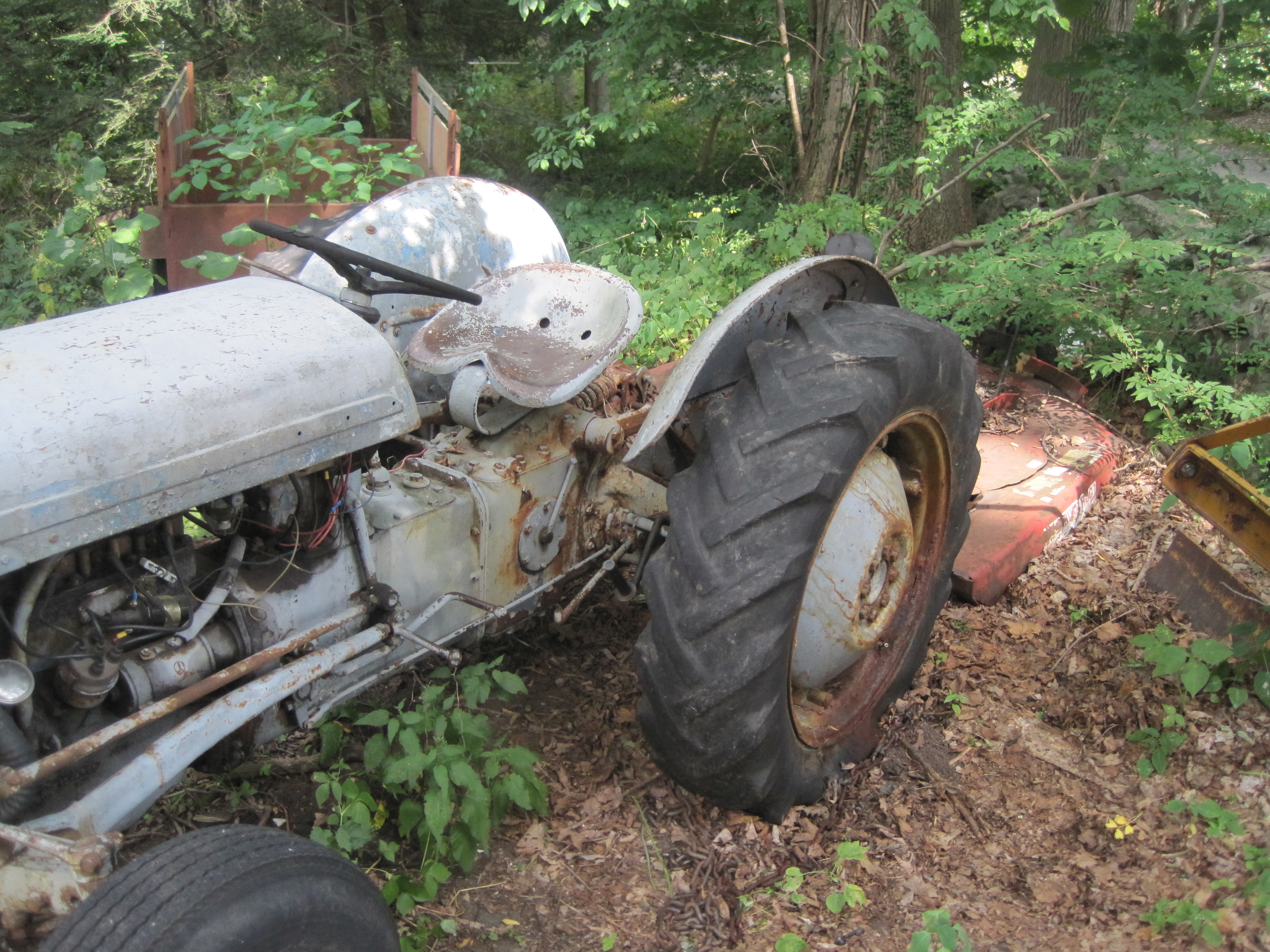 New tires, with tread! Purists will grumble about switching from the original tread pattern (there is a subtle difference), but this is a working tractor not a show tractor, so we went with solid tires rather than pretty Chinese/Thai. The aim is to be able to keep open some areas that otherwise are impossible and, with this tractor largely out of commission, reverting to brush (mostly bittersweet and barberry), plus there is a reasonable possibility that the near future may involve more work in the woods. And the Fergusons, with a high ground clearance but a paradoxically low center of gravity, are ideal for the firewood/bush hog trade in rough ground. They’re not much good for things that need hydraulics: front end loaders, backhoes, snow plows, etc. But as iron mules….they’re just fine.