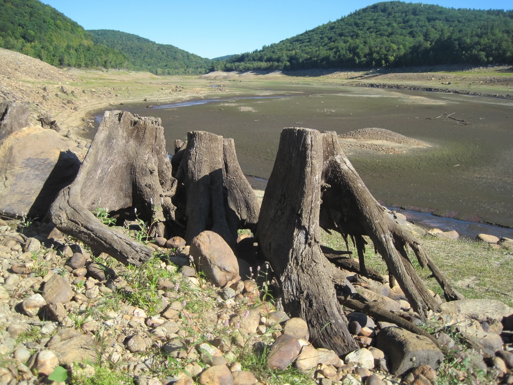It is right there, honest! It was located right behind the tree stump, this photograph would have been of its side and nothing else. It is interesting to note that one of the two channels the river is taking is the old raceway for the cotton factory. The other, of course, is the old main channel. Despite being out of use for over a century and inundated by flood waters for sixty plus, the old river bed channels remain very real and very active in a reservoir, even in this location which has accumulated feet of silt and mud already. They are by no means flat pools.