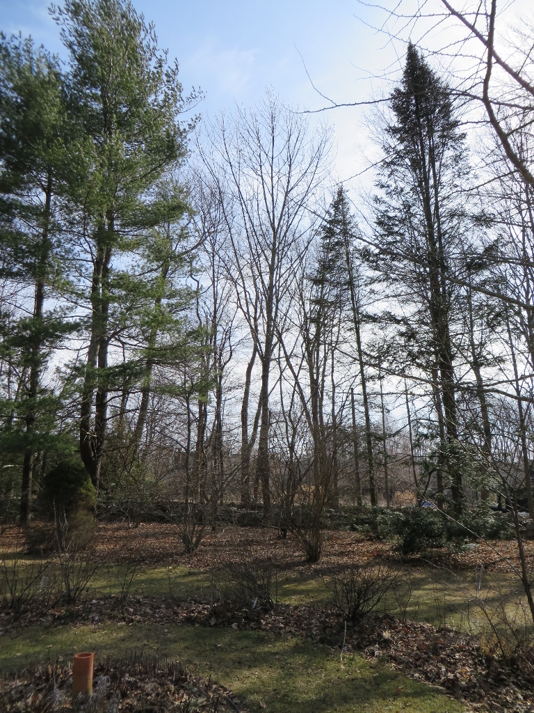 It is in the center back of the picture, you can see that despite that problem with the trunk it is developing a decent crown and is remarkably healthy. That actually makes it a more pressing concern: at some point the weight of that crown will snap the trunk at that point. The only place it wants to go is straight towards the camera. It could be slightly shifted to the left, but even that would cause major damage to the Star Magnolia, the middle shrub in the back rank of shrubs.