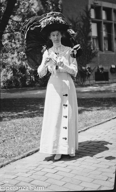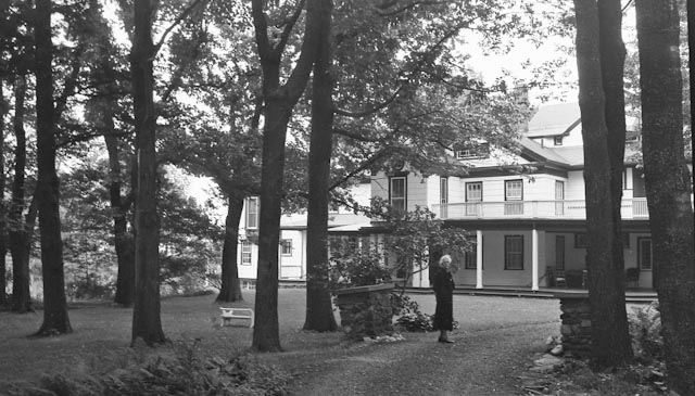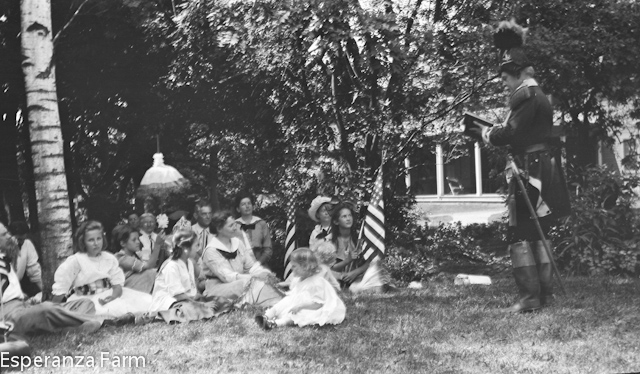 This is one of ‘those’ photos wherein identification is difficult. The man seated on the far right is Morris Smith, Julie’s husband; interestingly, he almost always appears in photos seated and in profile, he clearly didn’t care for informal photographs of himself. The woman seated in front in the dark dress is Carlotta Norton Smith, with a hat in her lap. Beyond that, things get difficult. The guest book does tell us that in the few days before the 14th, William Gillette (of Gillette castle fame), Helen Foster (a close family friend) and two men with the last name of Bartlett, one from Hartford and one from New Orleans so presumably business associates of Morris or friends of Carlotta, came to visit. It doesn’t tell us how long they stayed. And there were any number of other people visiting in July of that year according to the guest book….no doubt if I work at it, I will figure it out a bit more…sort of like those infernal puzzles about the girl in the blue house has pet x and the boy with the dog lives in the house of y colour. (all of which assumes the date on the negative is accurate)
