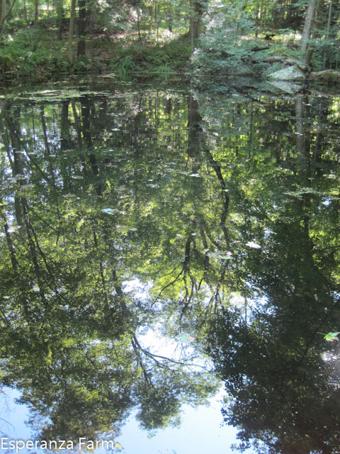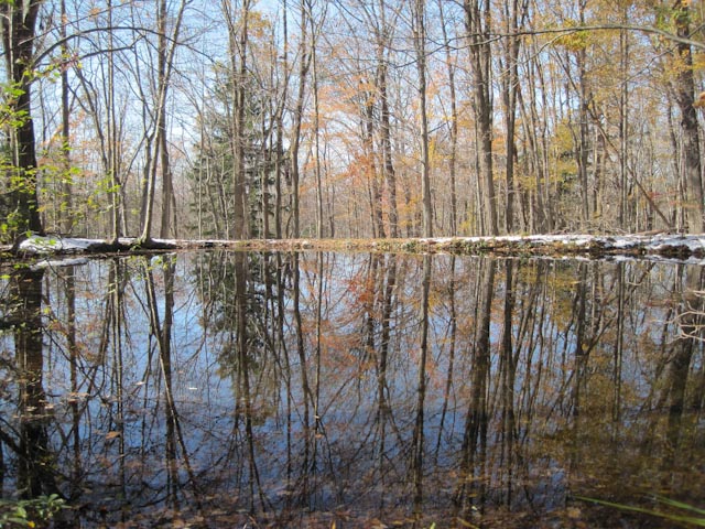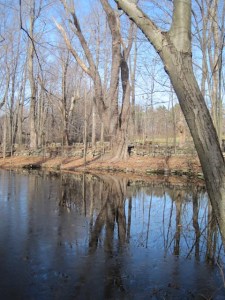 Landscape design often deliberately attempts to create something that looks natural, even when it isn’t. Or that emphasizes certain natural elements and uses man-made elements to draw the eye. To do this well is fiendishly difficult. The pond on a lesser scale reflects the same sort of picturesque, shaped landscape that was a signature feature of the movement in the nineteenth century that was best realized in North America under Olmsted’s creations of Central Park, the Boston Fens, Mont-Royal in Montreal and other places. That it happens that such places can be ecologically as well as aesthetically pleasing makes it even better. The pond has played host to several groups of migrating wood ducks, teals and mallards, as well as the ever present wood-peckers, the innumberable amphibians, turkeys, deer and many others. It has healthy , if small, populations of partridge berry, pippiwessa, ilex, laurel, highbush blueberry, three or four fern types, and hopefully will have trilliums, Indian cucumber, native sweet flag and cardinal flower. By taking the ash out, the dominate feature of that bank (oak/hickory) will hopefully be given emphasis…it is what would primarily occur there anyway, but without any distractions. The trick is figuring out what counts as a distraction and what is integral, either ecologically or aesthetically.