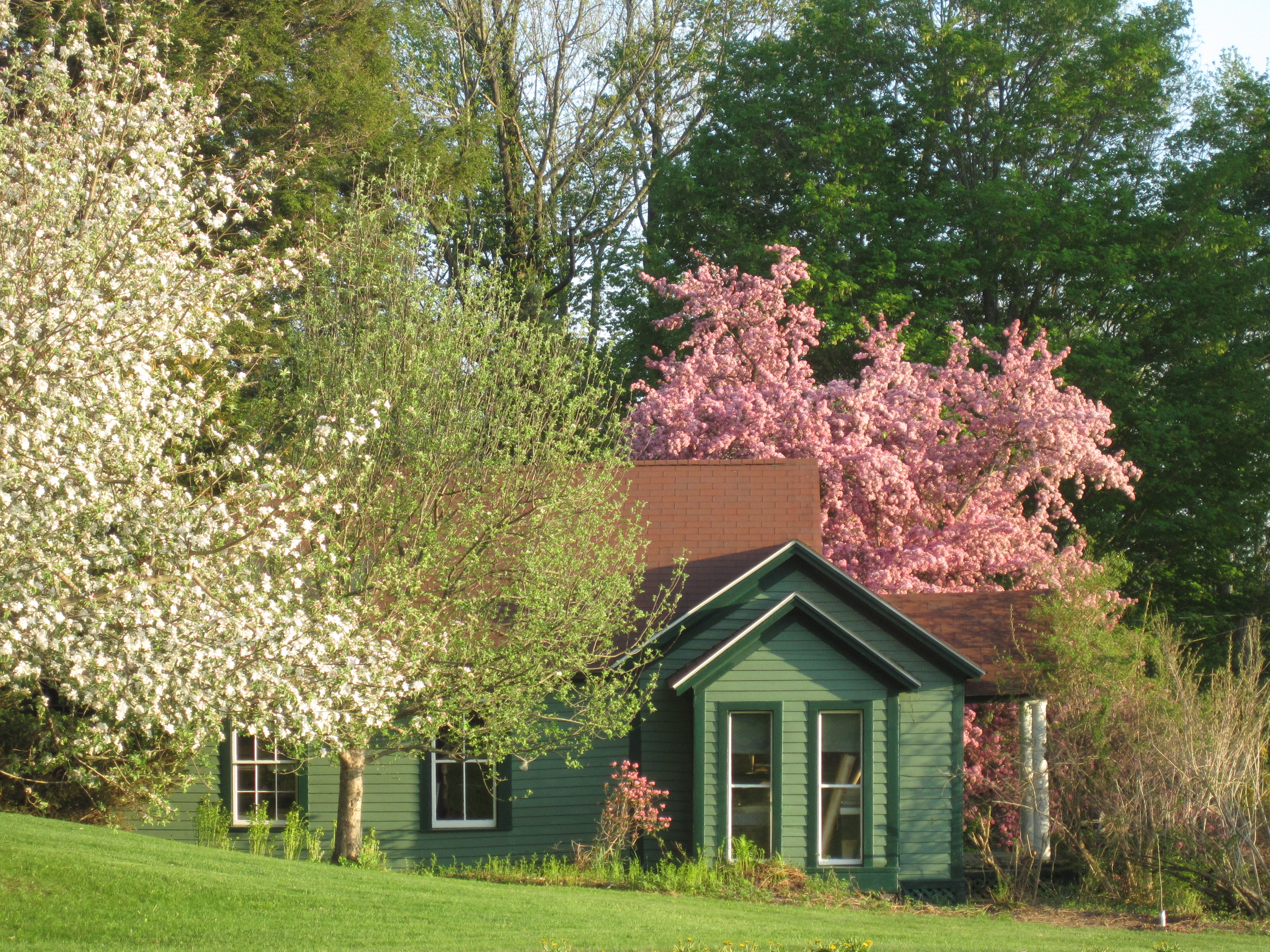 You can see, bottom right, a bit of white? That is a new apple tree, one of the two Golden Delicious that we just planted. The non-blooming one actually, finally, has a few blossoms and is a Prairie Spy. Up by the kitchen there is a Spigold. To the left is the Wolf River. Not visible is the big old McIntosh. Also not visible is the white crabapple.