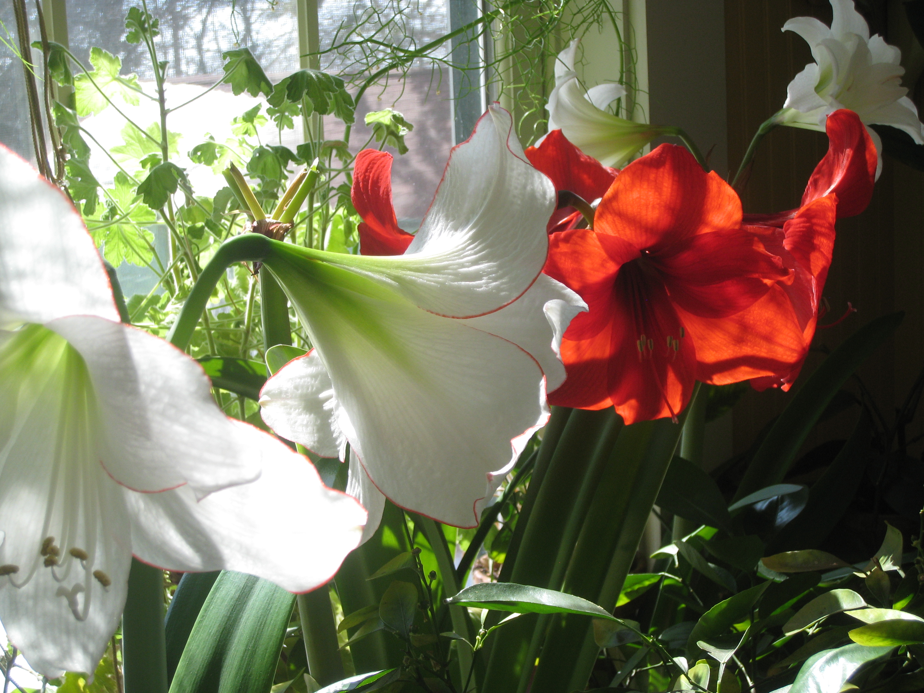 They spend the summer outside, (happy and green in the shade), a few months in the basement (dark and dry), and then spring into life in the winter with the judicious application of radiators and water. We even have babies from seed. Have no idea how that will work. They do pretty well, the red one in the photo above was a surprise last year. We had kept him for years, but he hadn’t bloomed in quite some time, and then last year he finally decided to once again. The ones you buy at the store are awfully confused for several years.