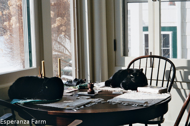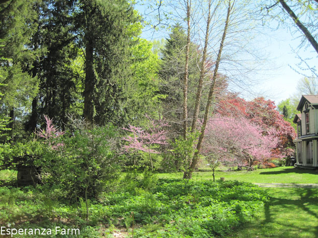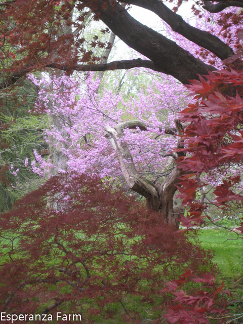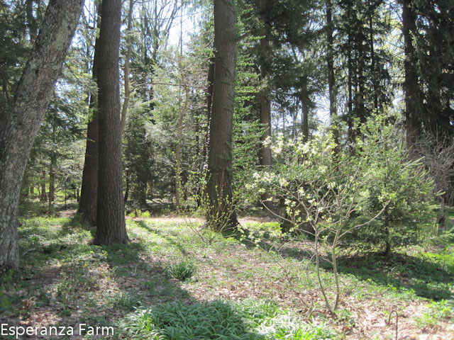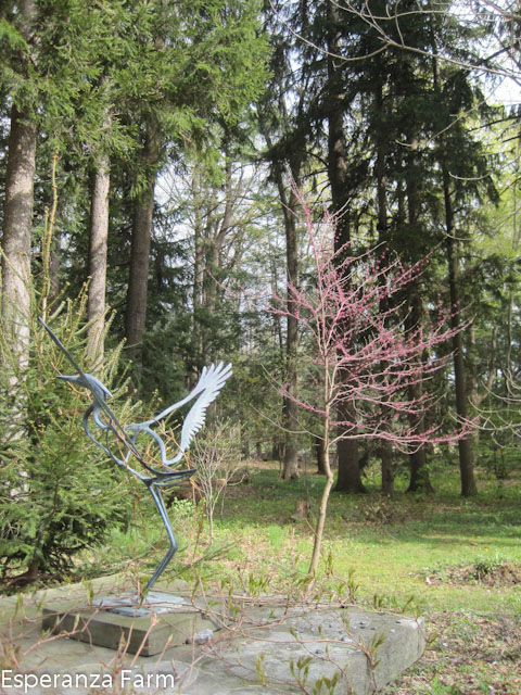 For decades the north path wove its way past the garden shed, beneath the great locusts and hemlocks, and crossed into the garden between the great square boundary pillar and the twenty foot tall remains of the big cottonwood. The tree had been nearly three feet in diameter, after it fell about twenty years ago years the remant snag was left. Totally hollow, it fit the image of the slightly spooky, slighty romantic ruined tree trunk; the imagination could run rampant, maybe a parliament of owls, maybe a racoon family, maybe bats, weasels, snakes, maybe a person could hide in it? It was an elegant ruin, visible from several places in the garden, adding a sense of age, memento mori. In later years it was crowned by woodvine, crimson in the fall. And it was the woodvine, which held it together, that in the end probably pulled it over.