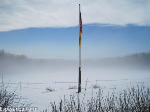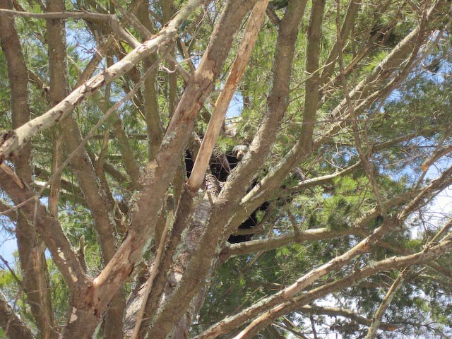 From the path, it fell to the right, the young conifer is behind the locust’s trunk in the photo.