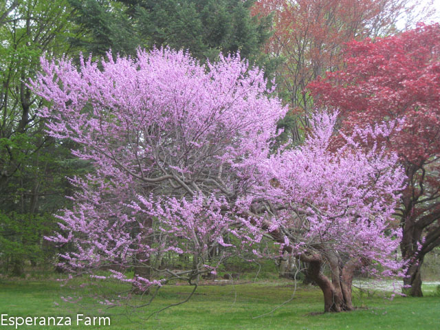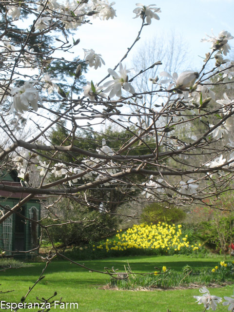 You can just see the trunk, directly above the middle of the viburnum (white shrub!) in this picture.