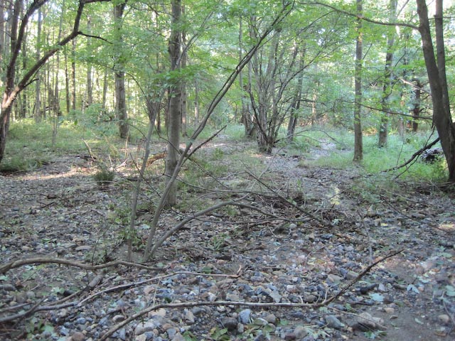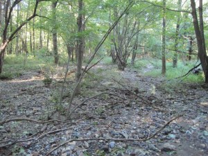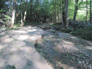 This picture shows the bottom of one of the two flows from the lane, about 400 feet down hill from it. I am standing where there had been one of the few remaining colonies of wake-robin trillium in this parcel, now a drift of rock about 8 inches in height.