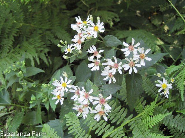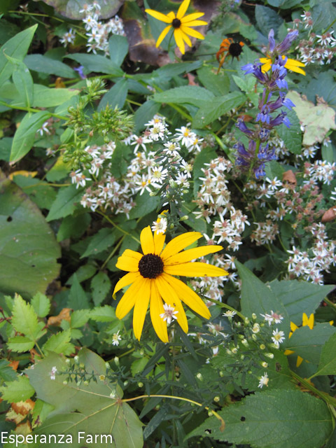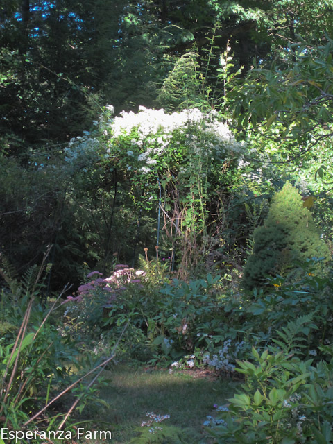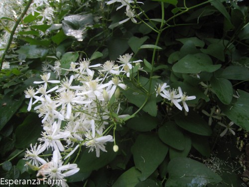 Garden for any length of time, and one quickly racks up a list of plants that, one feels, people ought to use more. Right near the top of my list is the (Sweet) Autumn clematis, also known as Old Man’s Beard. This fall! flowering New England native is fast growing, capable of hitting thirty feet, able to withstand mild drought, heat, and -20F winters without die-back. And if it does die back, gets broken, accidentally mown, or pruned by default because it is another plant that must be pruned? It is capable of coming back up from the base and blooming on new growth. The flowers are sprays of pure white with a powerful, sweet scent reminiscent of grapes. It starts blooming at the end of August and will continue throughout September. The various pollinators love it but I have yet to see anything eating it (though it clambers over a rose routinely defoliated by aphids and Japanese Beetles). About the only thing it likes is shady feet, but even that is something one can work around: I planted a seedling (about three inches in height) in full sun this spring, before this wickedly hot and dry summer; it took a little while, but it is already three feet tall. Why it isn’t used for privacy screens, patio fences, and a multitude of other hard uses? A mystery.