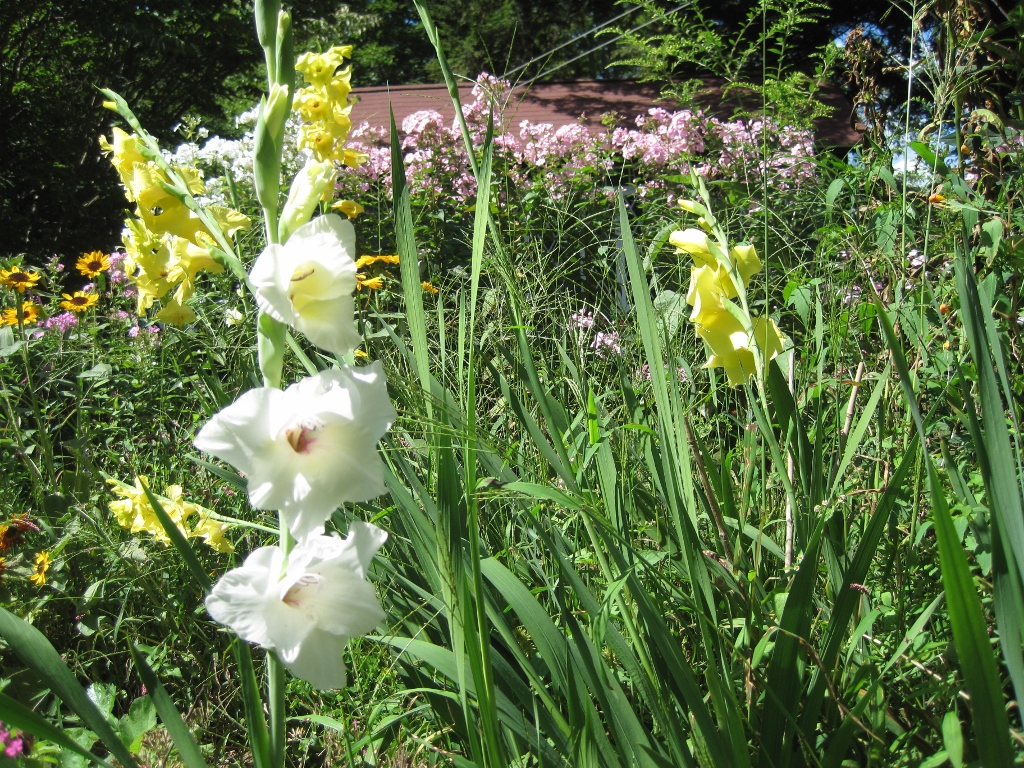 That white Gladiolus, seen in the vegetable garden last year and this year chucked rather quickly into the big garden, has managed to bloom. Despite the late planting in heavy, soggy soil, several of the bulbs have managed to bloom. I didn’t think they would since I planted them in late June; I just hoped that by planting them, I would be able to save them for next year. So far, a nice yellow and the white. It would be wonderful if the crimson and rose would bloom as well; but the yellows are most probable given last years numbers. Still, who am I to complain about this!