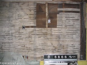 Taken during the remodelling of the kitchen eight! years ago, this shows the old south wall of the pre-1870’s farmhouse, before all the additions. The old lathe is visible, over it is the new diamond wire mesh for the new plaster. What is also visible is a shadow on the wall, actually a stain. The diagonal line running from the center of the stove to the top of the photo is the old stairs, also present are the stair treads. These stairs were removed in the 1870’s when the south end was expanded. While it was known from the floorboards of the room above that stairs might have existed, there was no proof until this renovation project. Putting in the new plaster simultaneously revealed and, probably, destroyed this stain. The photo, therefore, becomes an invaluable source of information.