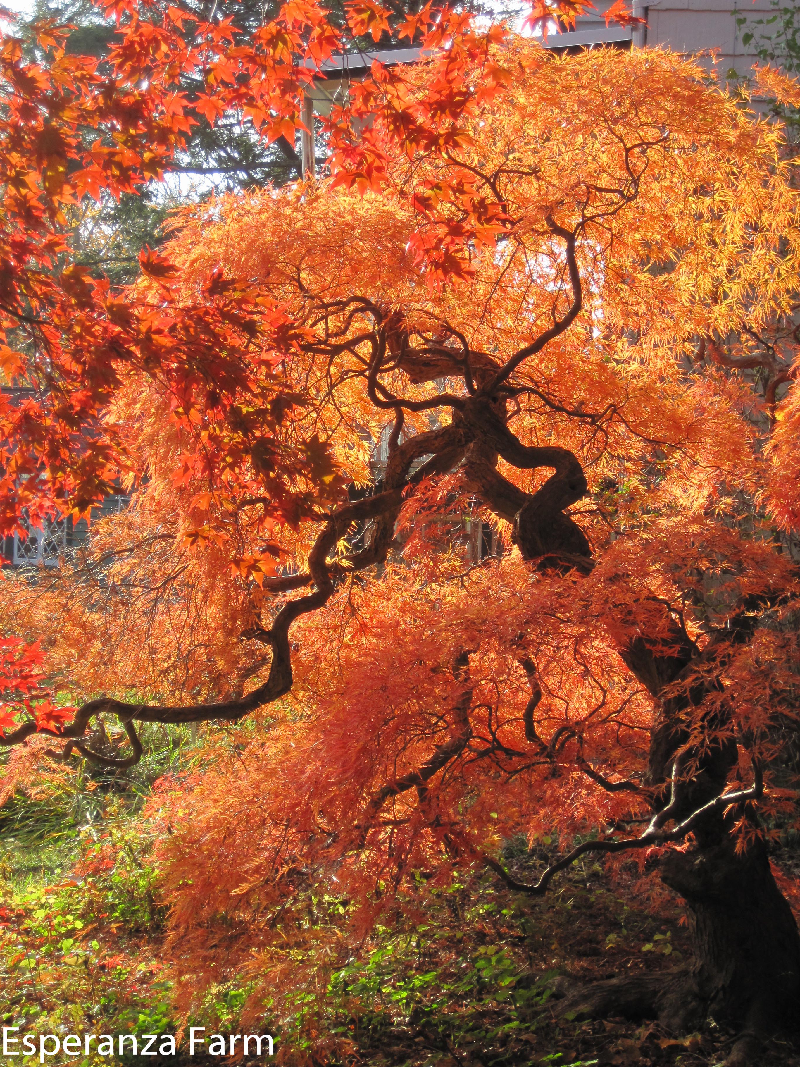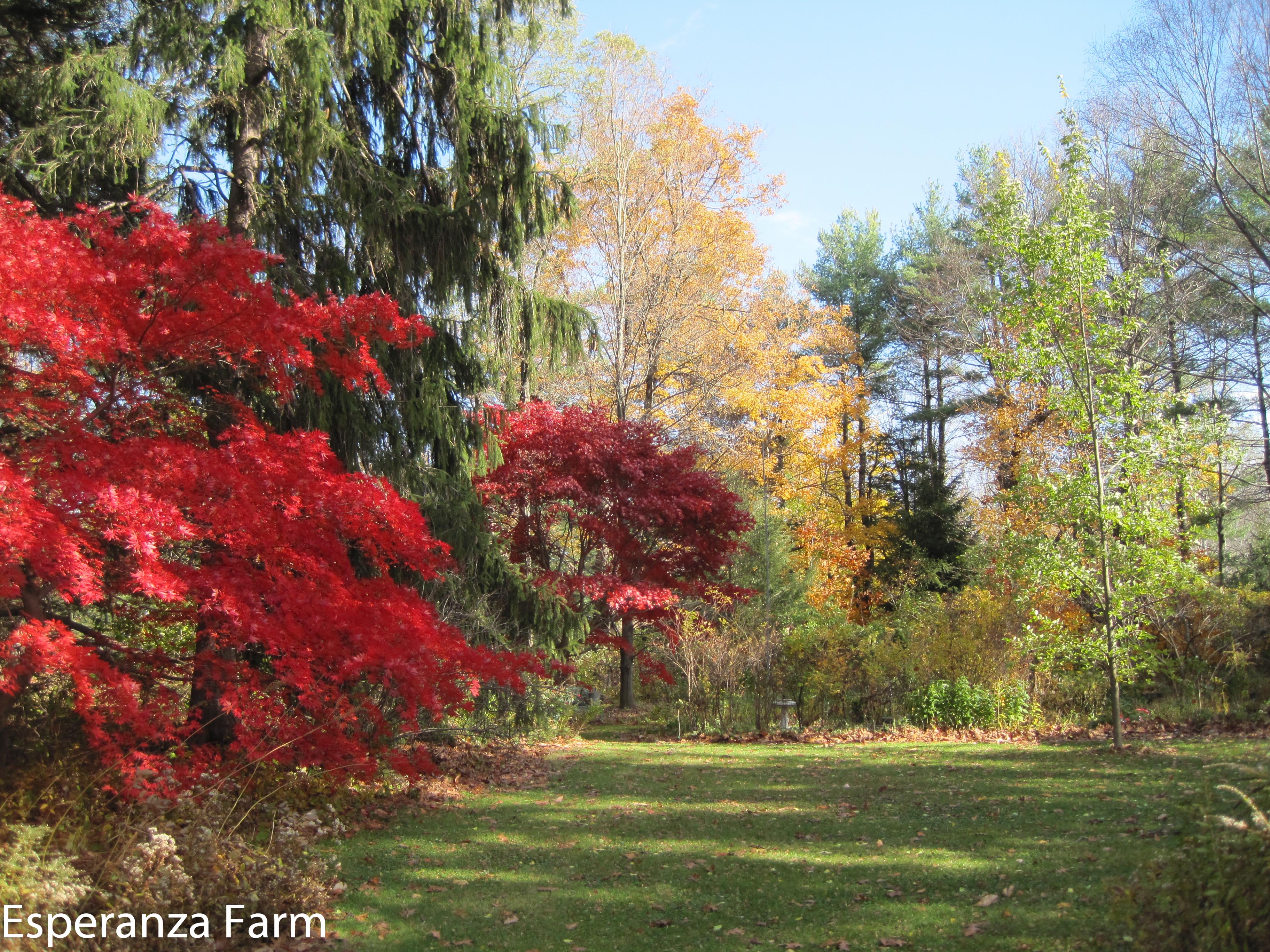 Japanese Maples aren’t usually planted for their fall color, which is a pity. Our various seedlings tend to fall into two types of color: pure scarlet or flame orange. (and a lot of muddy ones where the red just doesn’t quite do it, but is definitely red) A few are orange. The greener the bark, the oranger the coloration in the fall. In general, the orange/green have relatively green summer foliage, which is probably why they are less common (until recently we tended to select on the basis of summer foliage). For one reason or another, we decided to plant two rather nice green ones flanking the drive, I decided I liked them, and we have since added several more. Which means that we have succeeded, somewhat not accidentally in developing what (in several decades) will be a real grouping of orange maples in the Rabbit Hole drive, an accomplishment that really was only apparent this year, as several are very small still. The fall color, no surprise, comes from the two different parents, along with the trunk/twig coloration. The orange seems to come from the fine cut-leafed dwarf maple parent, the red from the bigger, rather coarsely cut full sized parent. The red is always a pure color with no shading on the leaf. The orange tends to shade towards the veins/edges, creating an appearance similar to Stewartia or Dogwoods, where the tree is not a single color.