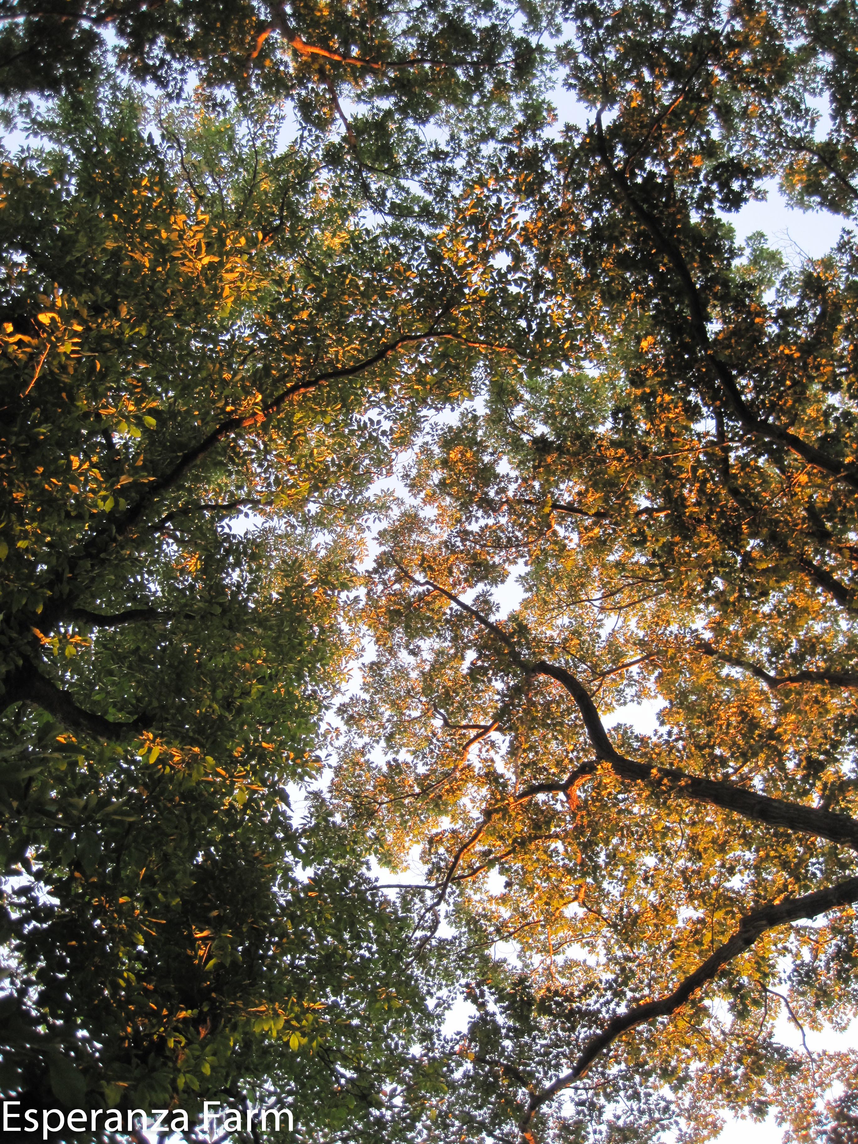 Technically, in a forest a fully mature stand is referred to as having a ‘closed canopy’: the tree has grown together and there is no open sky. If viewed from above the two big oaks and the cucumber magnolia have a closed canopy. You won’t see the north lawn in the summer from above no matter what you do. However, trees like their space, they compete, they quarrel, and they do not happily share. You can see the dividing line quite nicely in this photo, looking straight up: the magnolia is the left side, the oak the right (the third oak has a bit of the top left as well)