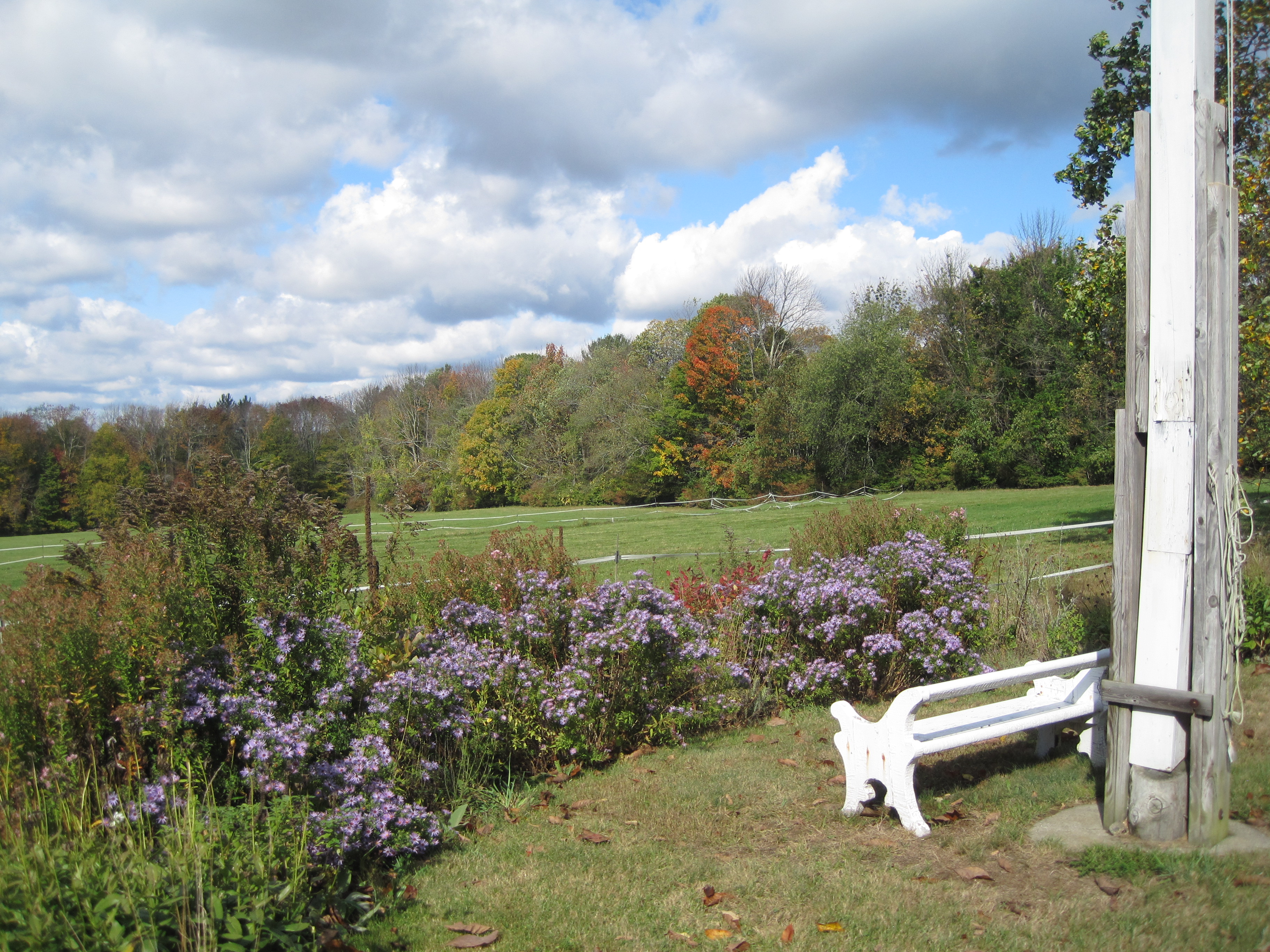 Japanese Maples aren’t usually planted for their fall color, which is a pity. Our various seedlings tend to fall into two types of color: pure scarlet or flame orange. (and a lot of muddy ones where the red just doesn’t quite do it, but is definitely red) A few are orange. The greener the bark, the oranger the coloration in the fall. In general, the orange/green have relatively green summer foliage, which is probably why they are less common (until recently we tended to select on the basis of summer foliage). For one reason or another, we decided to plant two rather nice green ones flanking the drive, I decided I liked them, and we have since added several more. Which means that we have succeeded, somewhat not accidentally in developing what (in several decades) will be a real grouping of orange maples in the Rabbit Hole drive, an accomplishment that really was only apparent this year, as several are very small still. The fall color, no surprise, comes from the two different parents, along with the trunk/twig coloration. The orange seems to come from the fine cut-leafed dwarf maple parent, the red from the bigger, rather coarsely cut full sized parent. The red is always a pure color with no shading on the leaf. The orange tends to shade towards the veins/edges, creating an appearance similar to Stewartia or Dogwoods, where the tree is not a single color.
